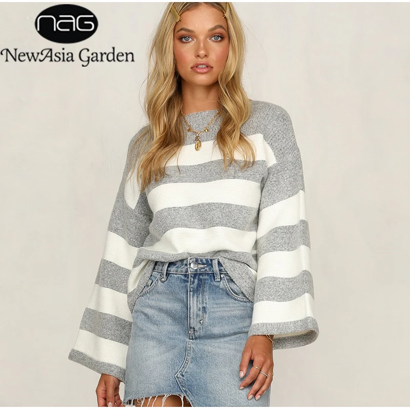 HIGH QUALITY NewAsia Long Sleeve Sweater Women 2019 Autumn And Winter Kintted Jumper Loose O-neck Gray Stripe Pu